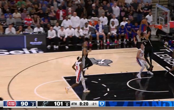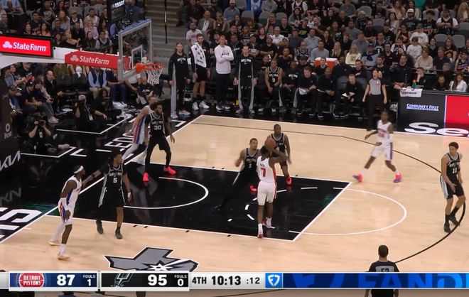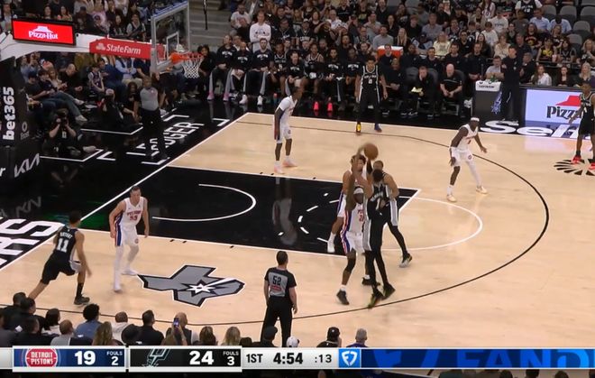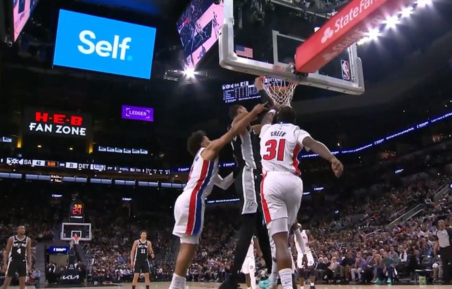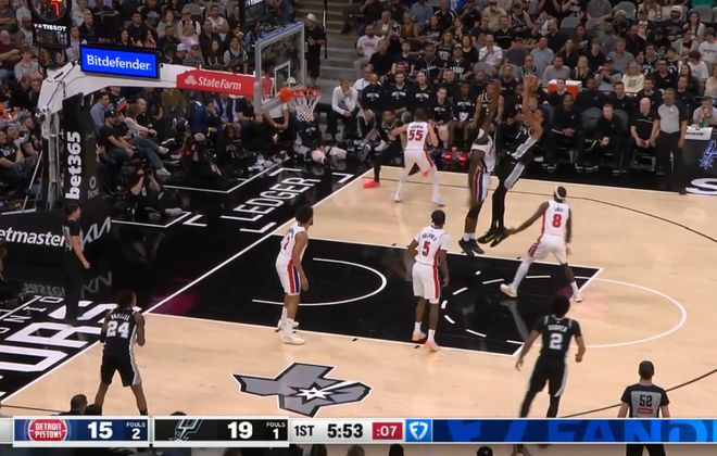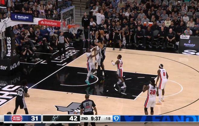 半場結(jié)束,文班亞馬得到24分,他在第二節(jié)送出了一記驚艷四座的十佳球補(bǔ)扣,當(dāng)時(shí)他一個(gè)假動作直接晃飛斯圖爾特,然后連過多人突到籃下,上籃不進(jìn)后,完成了一記補(bǔ)扣。